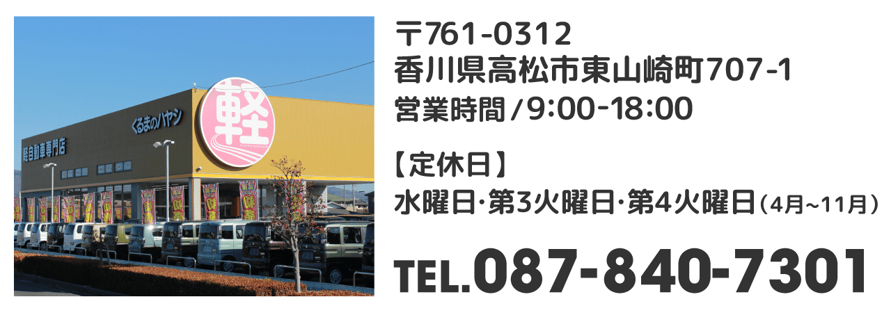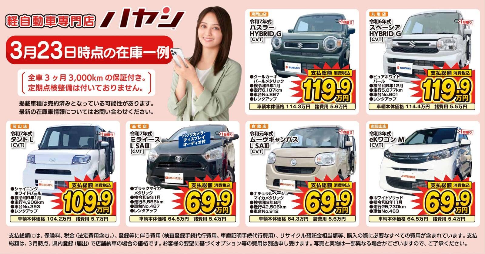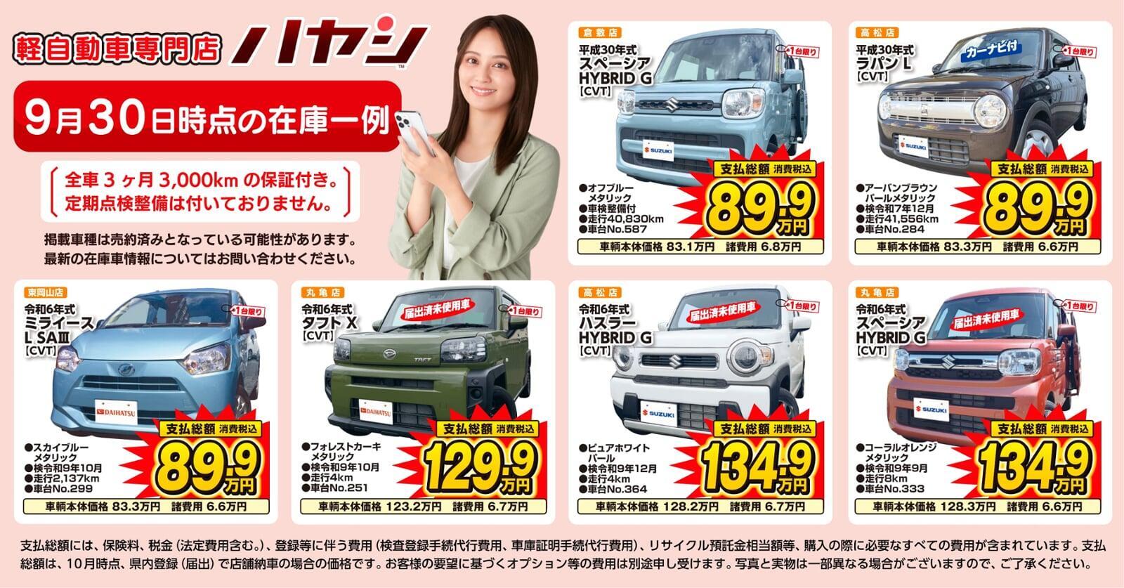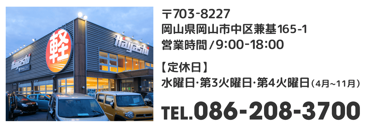 ハヤシは軽自動車専門店を岡山県・香川県に5店舗展開しており、在庫台数は地域最大級の500台以上!