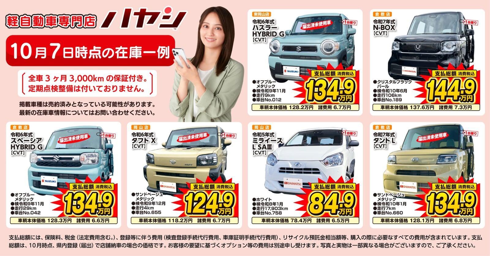 ハヤシは軽自動車専門店を岡山県・香川県に5店舗展開しており、在庫台数は地域最大級の500台以上!